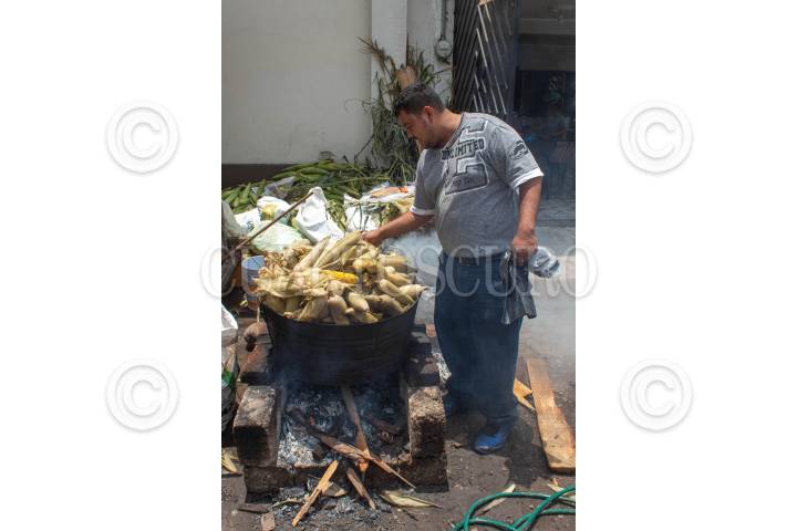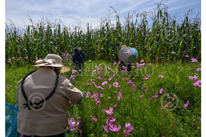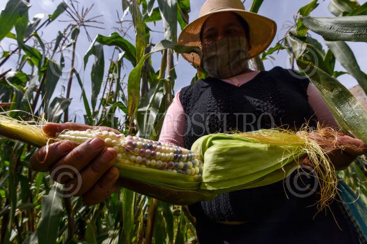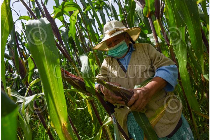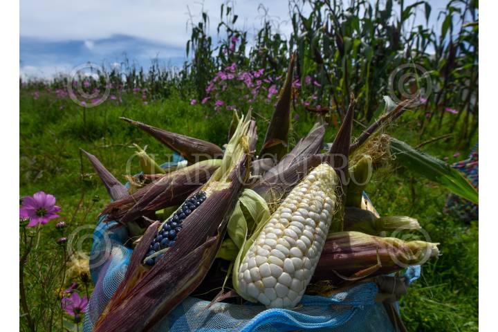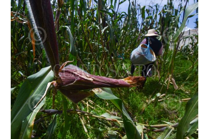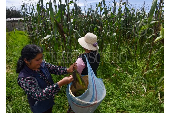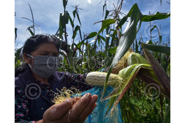 Mujeres de la zona indígena de Toluca a temprana hora acuden a los campos de cultivo a cosechar elotes y huitlacoche para preparar sus alimentos con productos frescos.