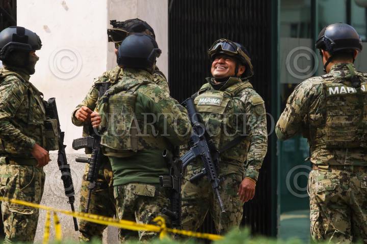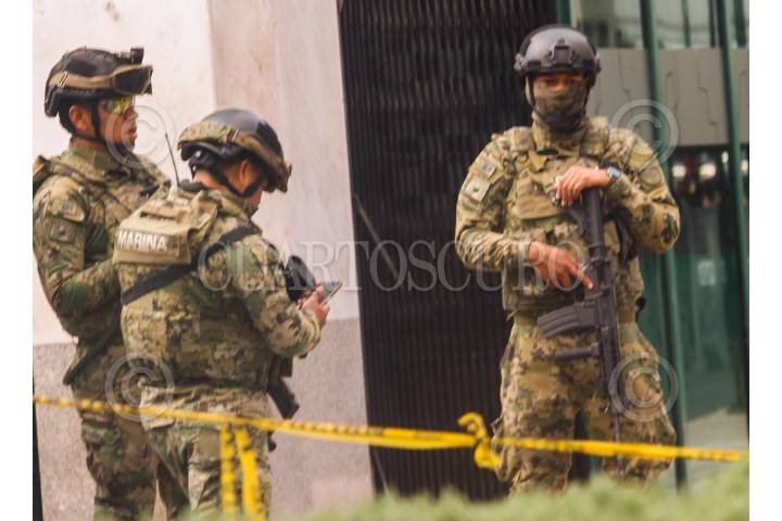 CIUDAD DE MÉXICO. 03FEBRERO2025.- Red Binacional contra Trump, realizaron un mitin frente a la embajada de Estados Unidos de América; demandaron que el paisa vecino de trato digno a los conacionales que encuentra trabajado y radicando en EEUU. Policías de la CDMX e integrantes de la Marina en las afueras de la embajada norteamericana. FOTO: VICTORIA VALTIERRA/CUARTOSCURO.COM