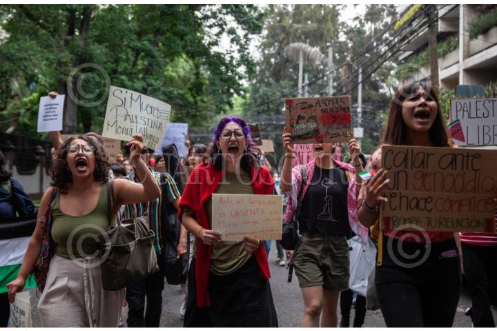 CIUDAD DE MÉXICO, 11JUNIO2025.- En el marco de la marcha global por Gaza, activistas marcharon de manera pacífica a las embajadas de España, Alemania, Francia y Países Bajos para exigir que rompan relaciones con Israel y que liberen a los 12 activistas y periodistas a bordo de la flotilla de la Libertad que buscaba llevar ayuda humanitaria a Gaza. FOTO: ANDREA MURCIA /CUARTOSCURO.COM