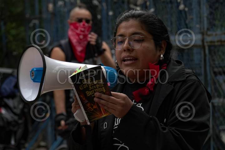 CIUDAD DE MÉXICO 14JUNIO2025.- Frente a la embajada de Estados Unidos una mujer recita un poema en protesta a las políticas migratorias aplicadas por el presidente Donald Trump, esto frente a la embajada de Estados Unidos. FOTO:ROGELIO MORALES /CUARTOSCURO.COM