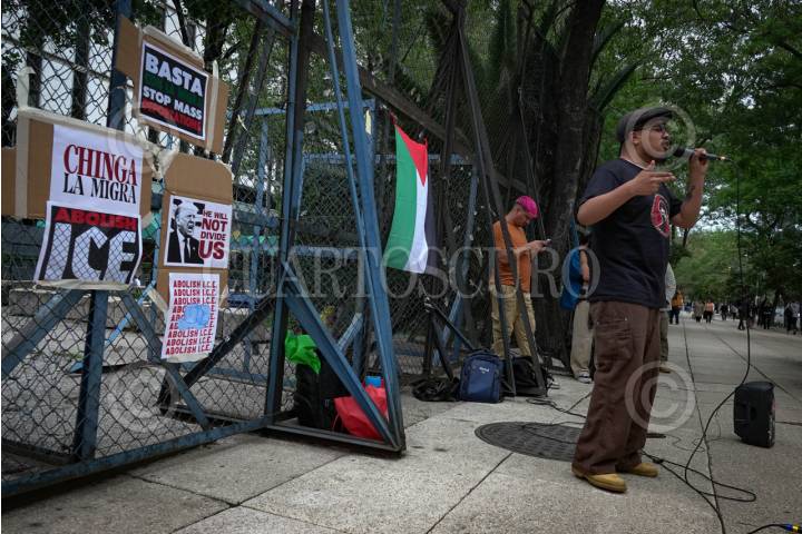 CIUDAD DE MÉXICO 14JUNIO2025.- Protesta por diversos colectivos por políticas migratorias aplicadas por el presidente Donald Trump, frente a la embajada de Estados Unidos. FOTO:ROGELIO MORALES /CUARTOSCURO.COM