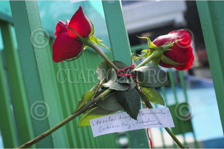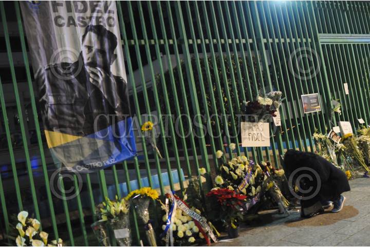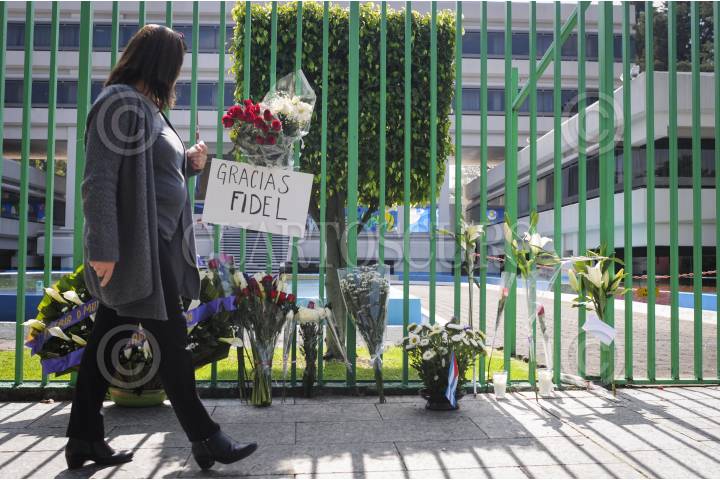 CIUDAD DE MÉXICO, 26NOVIEMBRE2016.- Cubanos residentes en México colocaron flores en las rejas de la embajada de Cuba luego de la muerte del comandante Fidel Castro la noche de ayer, según lo informado por su hermando Raúl Castro. Cubanos de la embajada izaron la bandera a media asta, el gobierno cubano decretó 9 días de luto por el fallecimiento del líder cubano. FOTO: DIEGO SIMÓN SÁNCHEZ /CUARTOSCURO.COM