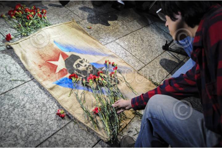 CIUDAD DE MÉXICO, 26NOVIEMBRE2016.- Jóvenes del Partido Comunista de México realizaron una marcha con antorchas del metro Polanco hacia la embajada de Cuba como un homenaje al comandante Fidel Castro, quien falleció la noche de ayer. En las rejas de la embajada cubana decenas de personas continúan colocando flores en honor a Castro. FOTO: DIEGO SIMON SANCHEZ /CUARTOSCURO.COM