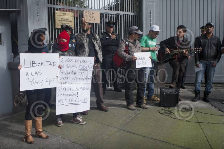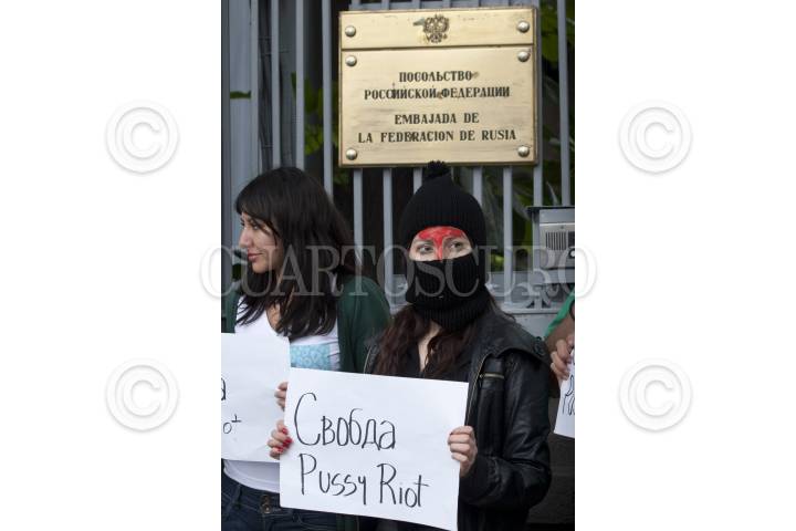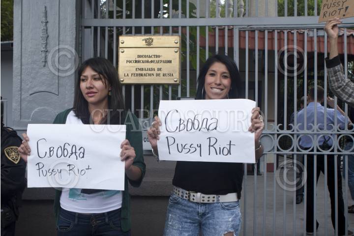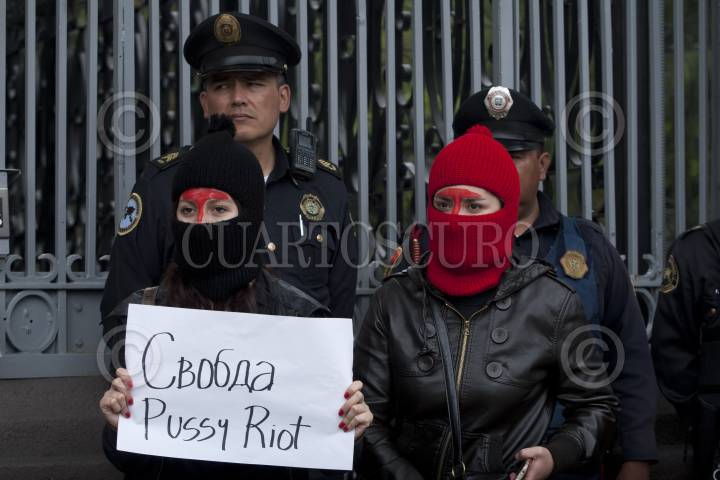 MÉXICO, D.F., 17AGOSTO2012.- Un grupo de jóvenes protestaron a las afueras de la Embajada de Rusia en contra de la condena de 3 integrantes del grupo ruso de punk Pussy Riot, las cuales fueron condenadas a purgar una pena de 2 años en prisión por cantar en una catedral ortodoxa contra el presidente del país Vladímir Putin. FOTO: FRANCISCO RODRIGUEZ /CUARTOSCURO.COM