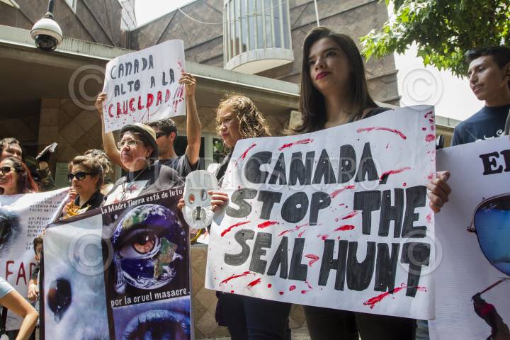 MÉXICO, D.F., 03MAYO2015.- Activistas preocupados por el Medio Ambiente protestaron frente a la embajada de Canadá en nuestro país en contra de la "crueldad" con que se mata a las focas en ese país. FOTO: ISAAC ESQUIVEL /CUARTOSCURO.COM