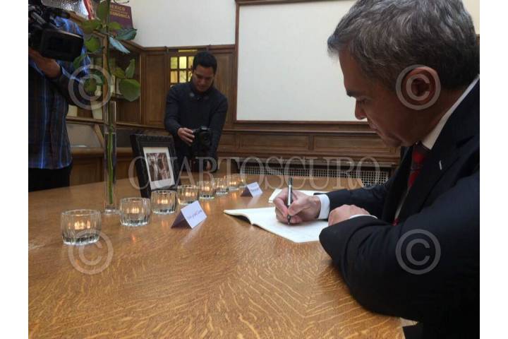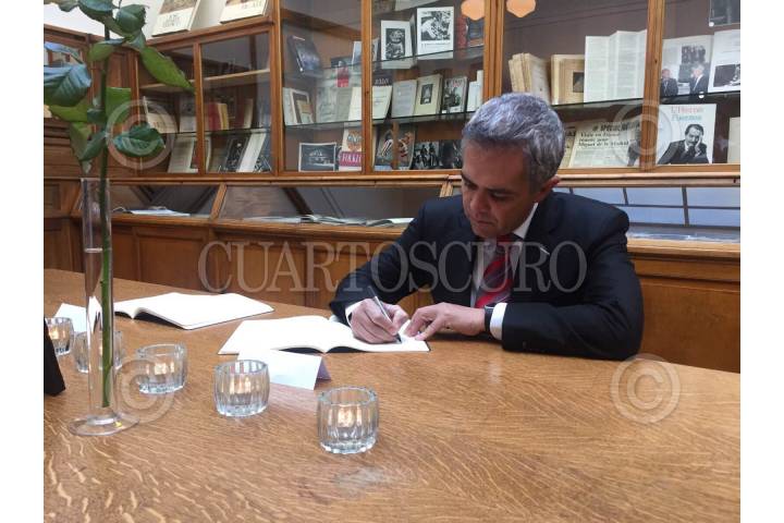 PARÍS, FRANCIA, 03DICIEMBRE2015.- En la embajada de México en Francia, el Jefe de Gobierno de la CDMX, Miguel Ángel Mancera Espinosa, firmó el libro de condolencias por las mexicanas Nohemí González y Michelli Gil Jaimez, quienes murieron en los atentados del 13 de noviembre en París. El mandatario capitalino se reunió con el embajador de México en Francia, Agustín García-López Loaeza, en el contexto de su gira de trabajo para participar en la Conferencia de las Naciones Unidas sobre el Cambio Climático (COP21). FOTO: GDF /CUARTOSCURO.COM