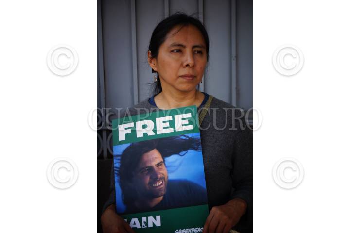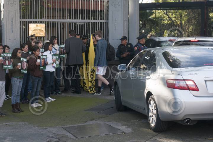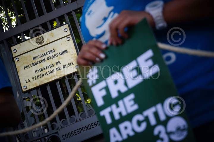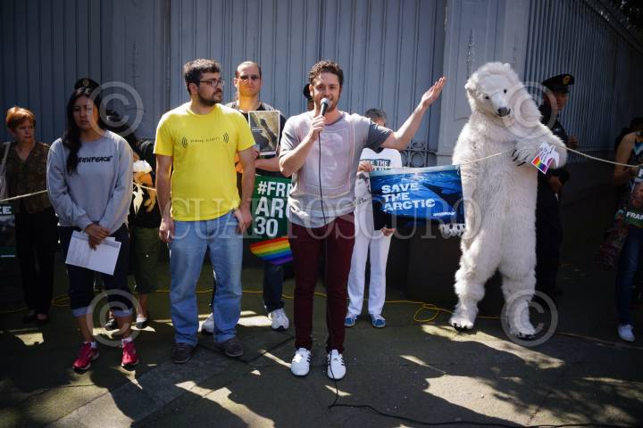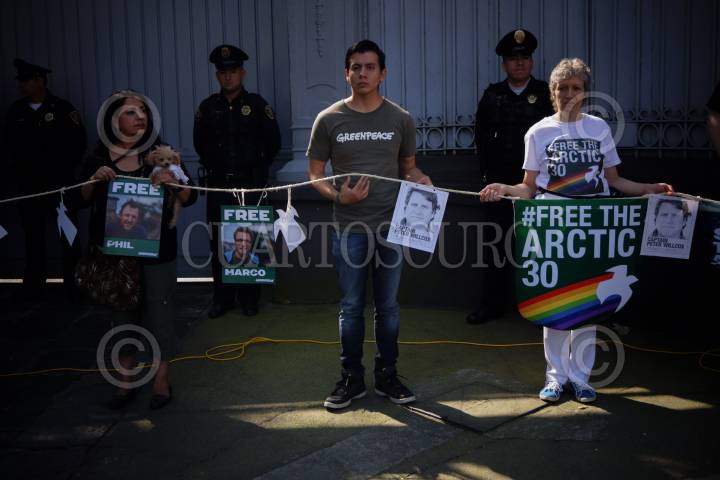 MÉXICO, D.F., 05OCTUBRE2013.- Miembros de la organizacion ambientalista Green Peace, se manifestaron a las afueras de la embajada Rusa, para exigir la libertad de los 30 activistas rusos encarcelados y acusados de piratería el pasado 18 de Septiembre por la policía de dicho país, mientras protestaban contra la perforación petrolera del Ártico Ruso. FOTO: PEDRO ANZA /CUARTOSCURO.COM