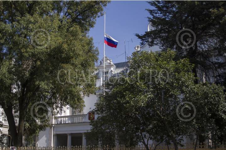 CIUDAD DE MÉXICO, 20DICIEMBRE2016.- La bandera rusa ondea a media hasta en la Embajada de dicha nación en nuestro país, luego de que ayer, el embajador de Rusia en Turquía, Andrei Karlov, fue asesinado a balazos en una galería. FOTO: ISAAC ESQUIVEL /CUARTOSCURO.COM
