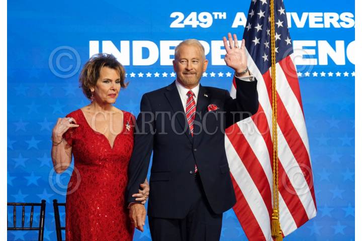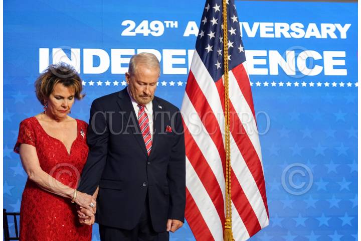CIUDAD DE MÉXICO, 26JUNIO2025.- Alina Arias Johnson, esposa del embajador, y Ronald D. Johnson, embajador de Estados Unidos en México, oran durante la ceremonia con motivo de 249 Aniversario de la Independencia de los Estados Unidos, próxima a celebrarse el 4 de julio, en la residencia oficial de la embajada. FOTO: GALO CAÑAS/CUARTOSCURO.COM