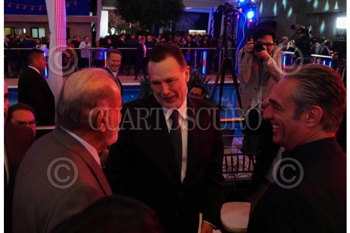 CIUDAD DE MÉXICO, 26JUNIO2025.- Francisco Cervantes, presidente del Consejo Coordinador Empresarial, el empresario Carlos Slim Helú, y Carlos Slim Domit, Presidente del Consejo de Administración de Grupo Sanborns, saludan al embajador estadounidense Ronald D. Johnson durante la ceremonia con motivo de 249 Aniversario de la Independencia de los Estados Unidos, próxima a celebrarse el 4 de julio, en la residencia oficial de la embajada. FOTO: GALO CAÑAS/CUARTOSCURO.COM