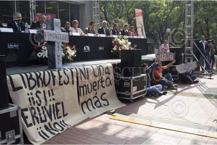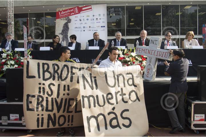 CIUDAD DE MÉXICO, 30MAYO2016.- Salvador Vega y León, rector de la Universidad Autónoma de México, junto con Dragoberto Rodríguez Barrera, embajador extraordinario y plenipotenciario de Cuba, realizaron el corte e inauguración del Librofest Metropolitano 2016 en las instalaciones de la UAM Azcapotzalco. Este año el Estado de México es el invitado especial al festival literario debido a la gran cantidad de alumnos que viven en dicha entidad, durante la conferencia previa al corte de listón estudiantes del plantel se manifestaron con pancartas en contra de la política del gobernador Erúviel Ávila y la llamada Ley Atenco. FOTO: GALO CAÑAS /CUARTOSCURO.COM