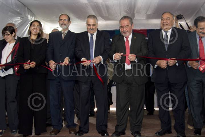 CIUDAD DE MÉXICO, 30MAYO2016.- En la imagen Aurora Denisse Ugalde Alegría, presidenta municipal de Tlalnepantla de Baz, acompañada de Salvador Vega y León, rector de la Universidad Autónoma de México, junto con Dragoberto Rodríguez Barrera, embajador extraordinario y plenipotenciario de Cuba, realizaron el corte e inauguración del Librofest Metropolitano 2016 en las instalaciones de la UAM Azcapotzalco. Este año el Estado de México es el invitado especial al festival literario debido a la gran cantidad de alumnos que viven en dicha entidad, durante la conferencia previa al corte de listón estudiantes del plantel se manifestaron con pancartas en contra de la política del gobernador Erúviel Ávila y la llamada Ley Atenco. FOTO: GALO CAÑAS /CUARTOSCURO.COM