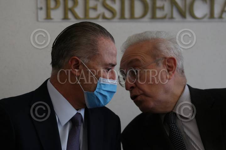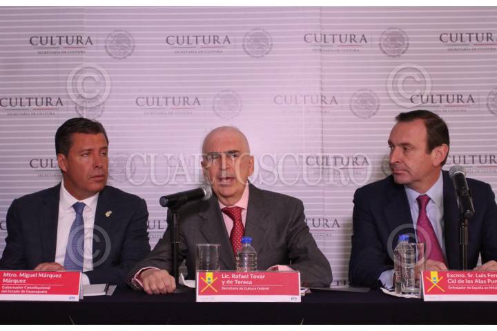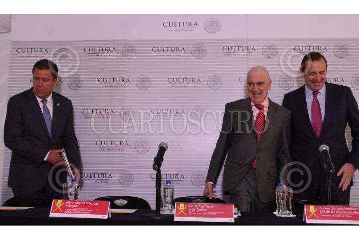 CIUDAD DE MÉXICO, 20ABRIL2016.- Rafael Tovar y de Teresa, secretario de Cultura, ofreció conferencia de prensa, junto a Jorge Volpi, Miguel Márquez Márquez, gobernador de Guanajuato, y Luis Fernández Cid de las Alas Pumariño, embajador de España en México, el programa especial Cervantes 400, que se realizará en Guanajuato para conmemorar el aniversario del escritor y dramaturgo. FOTO: MARÍA JOSÉ MARTÍNEZ /CUARTOSCURO.COM