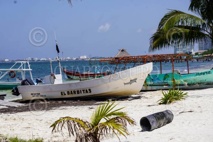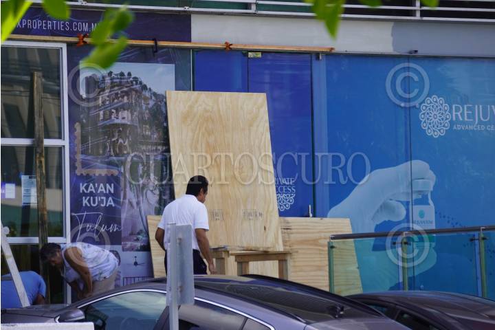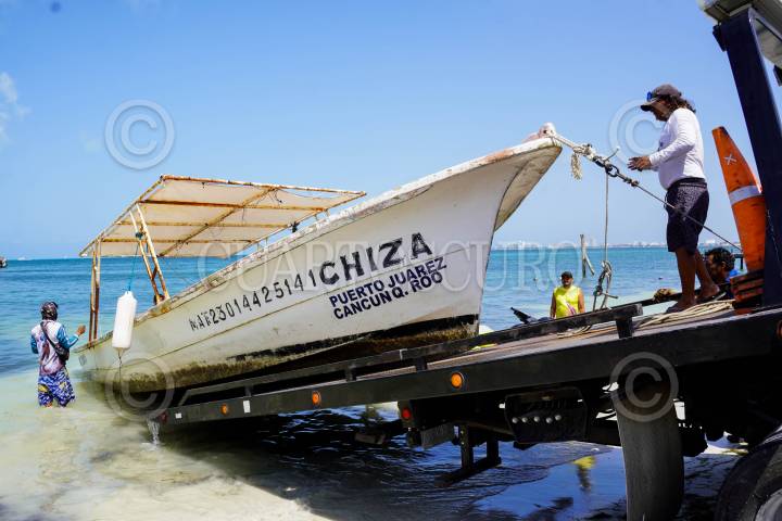 CANCÚN, QUINTANA ROO, 03JULIO2024.- Capitanes de embarcaciones en Cancún han decidido retirar sus lanchas de las aguas y colocarlos en tierra se espera del cierre a la navegación debido a la entrada del huracán “Beryl” el día de mañana. Asimismo, espectaculares han sido retirados y algunos comercios han reforzados sus ventanales con tablones de madera. FOTO: ELIZABETH RUIZ/CUARTOSCURO.COM