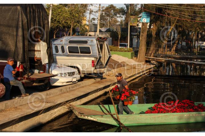 Un hombre un niño, descargan una trajinera de nochebuenas en el enmarcado Zacapa en Xochimilco. FOTO: ROGELIO MORALES /CUARTOSCURO.COM