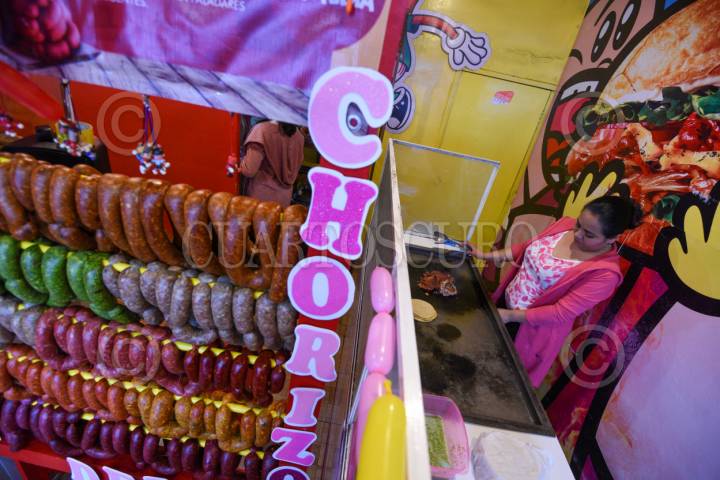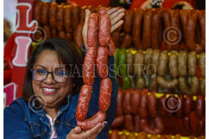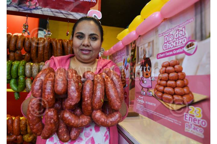 TOLUCA, ESTADO DE MÉXICO, 23ENERO2024.- Laura Patricia Juárez encabeza Chorizos Choridia de Toluca, que nace hace 15 años y es la tercera generación de Chorizos La Suprema, empresa pionera en la elaboración de chorizos artesanales en Toluca; preparan embutidos de diferentes sabores, sobre todo los frutales y tiene 40 tipos diferentes como la tradicional toluqueña, salsa verde, manzano habanero, morita con arándano y vino tinto, y sacaron uno en la tendencia coquette que es guayaba, fresa y chile chipotle, sandía con chile de árbol y fresa, mango habanero, durazno, guajillo con tamarindo y cada temporada manejan de dos a tres especialidades por mes, y no solo elaboran chorizos de carne de cerdo también preparan de pollo, pavo, res, pescado, vegetarianos y veganos, para todos los gustos. Para festejar el Día del Chorizo regalaron tacos a sus clientes así como bajaron sus precios. Buscan rescatar la cultura del buen chorizo, elaboración artesanal y de carne natural y de buena calidad, así como todos los demás ingredientes y distribuyen a toda la República Mexicana, sobre todo a Puebla, Veracruz, Mibterrey, Guadalajara, Campeche y Querétaro. Se encuentran ubicados en la Avenida Morelos en la ciudad de Toluca frente al Estaduo Nemesio Diez. FOTO: CRISANTA ESPINOSA AGUILAR /CUARTOSCURO.COM