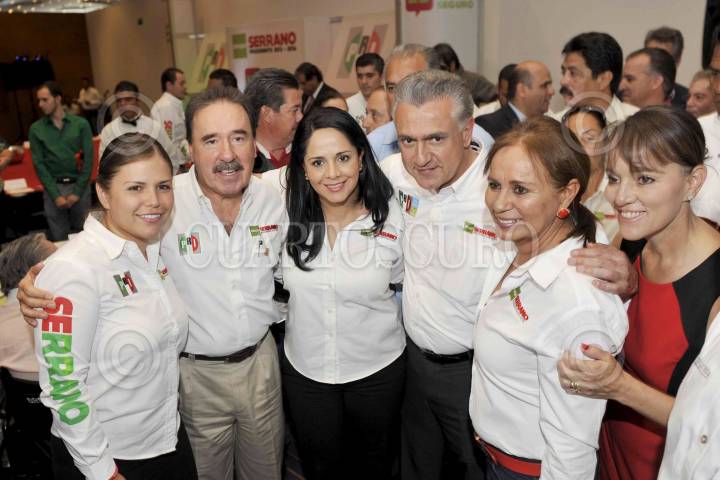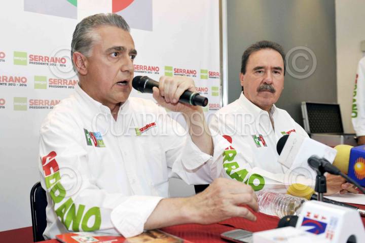 CIUDAD JUAREZ, CHIHUAHUA, 27JUNIO2013.- Emilio Gamboa, coordinador de los senadores del PRI, y Emilio Serrano, candidato a la Presidencia Municipal de Ciudad Juárez, en un evento proselitista en a apoyo a los candidatos priistas. Ofrecieron una conferencia de prensa con medios juarenses y acudieron a una reunión con empresarios y lideres de la industria. FOTO: CUARTOSCURO.COM