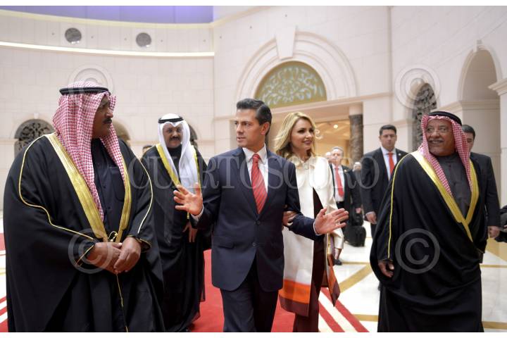 KUWAIT, 19ENERO2016.- El Presidente Enrique Peña Nieto, acompañado de su esposa, la señora Angélica Rivera de Peña, arribó hoy a Kuwait, para realizar una Visita de Estado. Fue recibido por el Jeque Fahd Saad Al-Sabah, Consejero del Emir, en funciones de Jefe de la Misión de Honor para acompañar al Presidente de México durante su visita. FOTO: PRESIDENCIA /CUARTOSCURO.COM