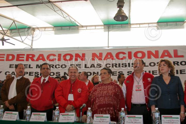 MÉXICO, D.F., 05ENERO2009.- Leonel Godoy gobernador de Michoacan, Fidel Herrera gobernador de Veracruz, Cruz Lopez, titular de la Confederación Nacional Campesina (CNC), Beatriz Paredes dirigente nacional del PRI, el diputado federal Cesar duarte e Ivonne Aracely Ortega gobernadora de Yucatan, durante la conmemoración del 94 aniversario de la ley agraria emitida por Venustiano Carranza, donde cientos del integrantes del CNC se congregaron en la casa del agraristas para celebrar esta fecha FOTO: RICARDO CASTELAN /CUARTOSCURO.COM