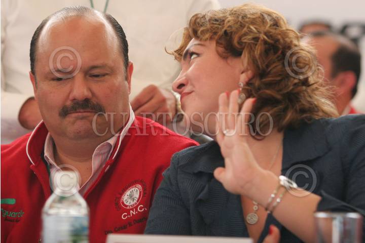 MÉXICO, D.F., 05ENERO2009.- El diputado federal Cesar duarte e Ivonne Aracely Ortega gobernadora de Yucatan, durante la conmemoración del 94 aniversario de la ley agraria emitida por Venustiano Carranza, donde cientos del integrantes del CNC se congregaron en la casa del agraristas para celebrar esta fecha FOTO: RICARDO CASTELAN /CUARTOSCURO.COM