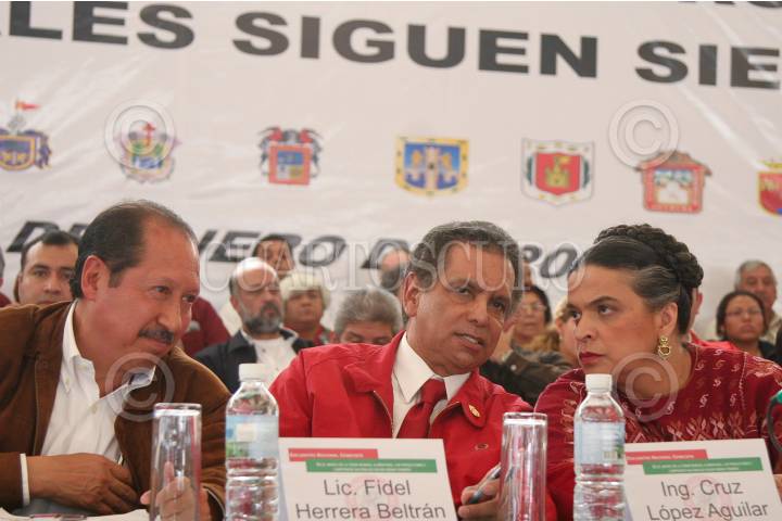 MÉXICO, D.F., 05ENERO2009.- Fidel Herrera Beltrán gobernador de Veracruz, Cruz Lopez, titular de la Confederación Nacional Campesina (CNC) y Beatriz Paredes dirigente nacional del PRI, durante la conmemoración del 94 aniversario de la ley agraria emitida por Venustiano Carranza, donde cientos del integrantes del CNC se congregaron en la casa del agraristas para celebrar esta fecha FOTO: RICARDO CASTELAN /CUARTOSCURO.COM