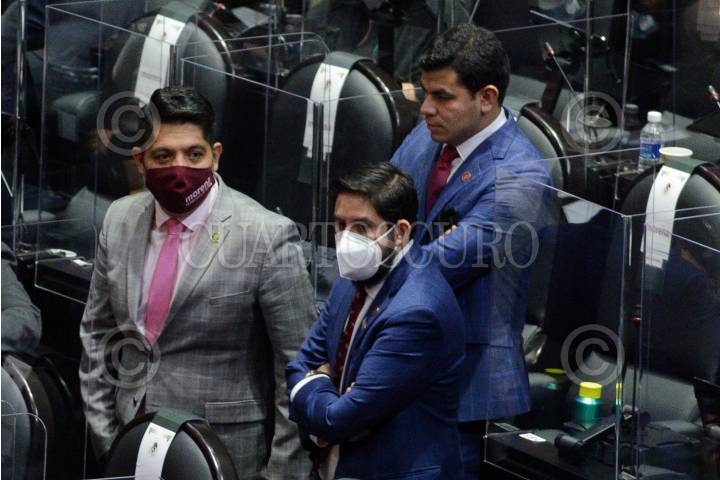 Emmanuel Reyes Carmona, Hamlet García Almaguer, y Favio Castellanos Polanco, diputados de Morena, presuntamente devotos de "La Luz del Mundo" durante la sesión ordinaria de la Cámara de Diputados.