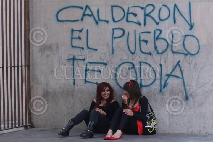 MÉXICO, D.F., 26FEBRERO2010.- Dos jóvenes descansan frente a una pinta en contra del presidente Felipe Calderón, en el Centro Histórico de la ciudad de México. FOTO: ISAAC ESQUIVEL/CUARTOSCURO.COM