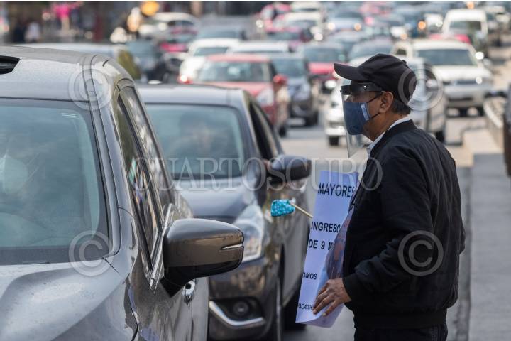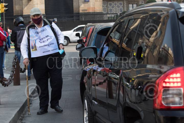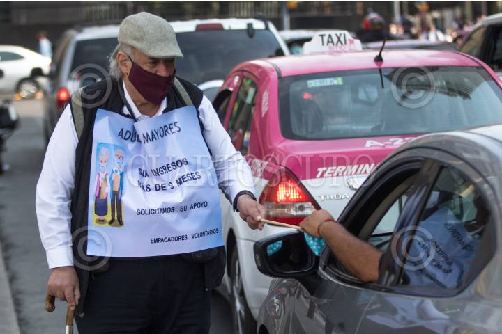 Personas de la tercera edad que se desempeñaban como empaquetadores en Centro Comerciales piden ayuda económica en avenida Juárez, ya que comentan que por la pandemia de Covid-19 y ser población vulnerable no pueden realizar esta actividad.