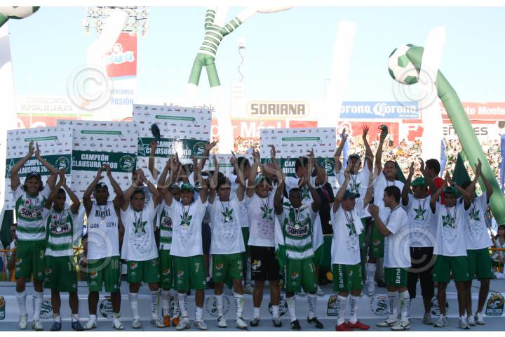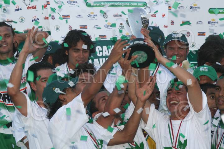TORREON, COAHUILA 01JUNIO2008 .- Jugadores del equipo Santos celebra con la copa el haberse coronado como campeones del torneo de Clausura 2008, tras empatar en el partido de vuelta 1-1 (3-2 global) ante el Cruz Azul FOTO: SASHENKA GUTIERREZ/CUARTOSCURO.COM