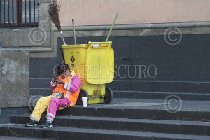 CIUDAD DE MÉXICO, 06NOVIEMBRE2016.- Una empleada de limpieza de la Ciudad de México se coloca un poco de maquillaje antes de empezar su jornada. Esto sobre las escaleras de la antigua sede del Senado de la República. FOTO: GALO CAÑAS /CUARTOSCURO.COM