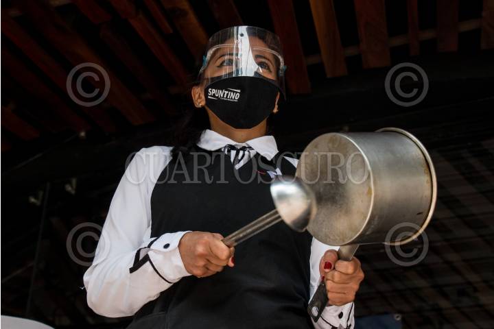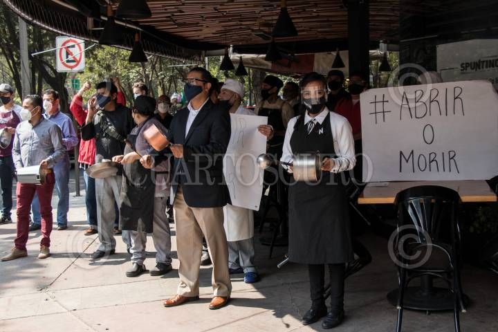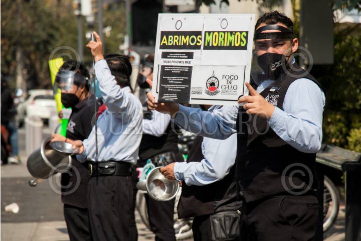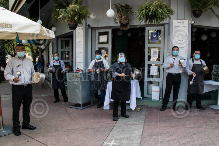 Cacerolazo de restauranteros en la zona de Polanco exigiendo a las autoridades poder operar durante el Semáforo Rojo.