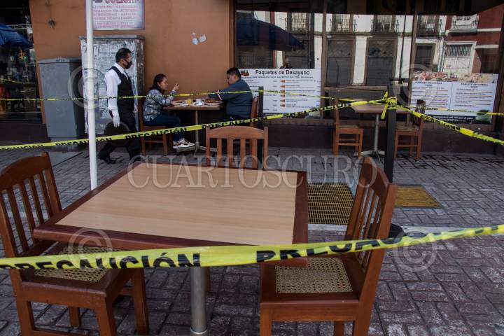Mesas de un restaurante de franquicia se observan sobre la calle 16 de septiembre en el Centro Histórico