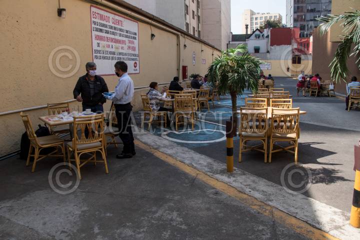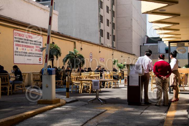 Un restaurante de cadena ha habilitado su estacionamiento para poder ofrecer servicio al aire libre.