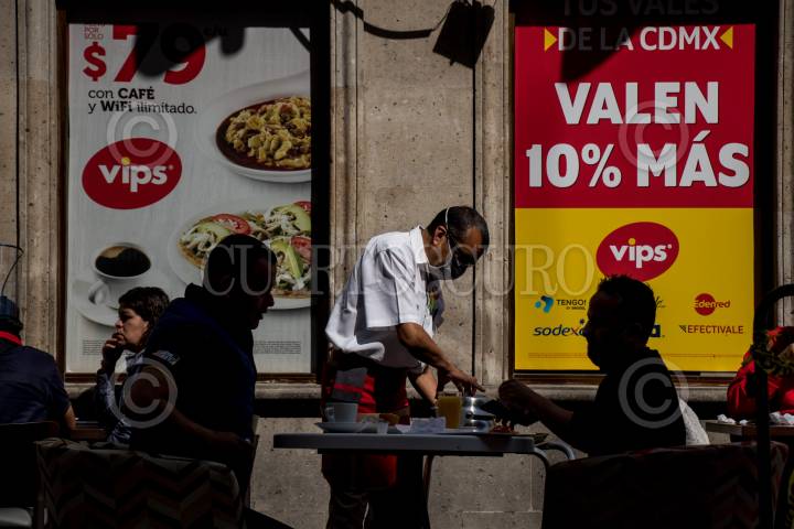 Mesas de un restaurante de franquicia se observan sobre la calle Francisco I. Madero en el Centro Histórico