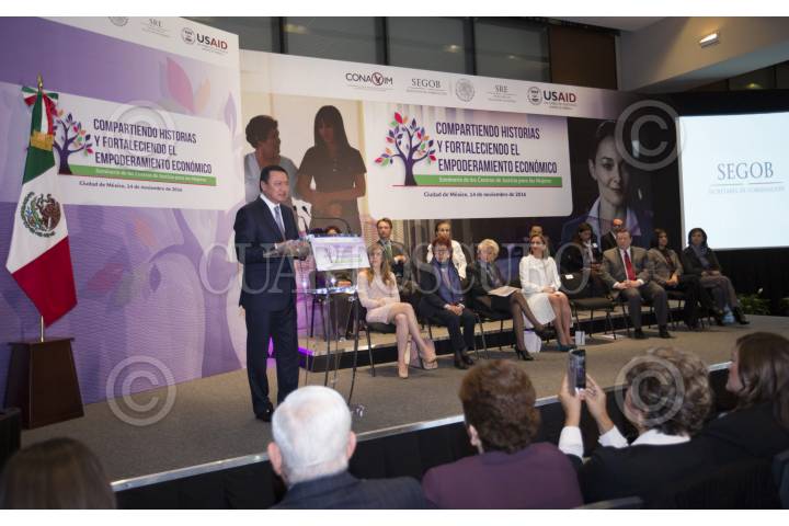 CIUDAD DE MÉXICO, 14NOVIEMBRE2016.- El empoderamiento económico de las mujeres y la lucha contra la violencia de género son tareas que van de la mano y se fortalecen mutuamente, afirmó el Secretario de Gobernación, Miguel Ángel Osorio Chong. Durante la inauguración del Seminario de los Centros de Justicia para las Mujeres Compartiendo Historias y Fortaleciendo el Empoderamiento Económico, la Secretaria de Relaciones Exteriores, Claudia Ruiz Massieu, aseguró que en la defensa de la dignidad y los derechos de los paisanos que viven en Estados Unidos y con mayor razón de la población más vulnerable que son las mujeres migrantes, no se dará ni un paso atrás. FOTO: SEGOB /CUARTOSCURO.COM