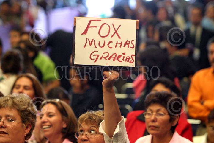 MEXICO, D.F., 24ABRIL2006.- Vicente Fox Quesada, presidente de la República, encabezó el encuentro internacional de mujeres empresarias sociales FONAES en el Centro Banamex. En la imagen un cartel con la frase "Fox, Muchas Gracias". FOTO: Moisés Pablo/CUARTOSCURO.COM