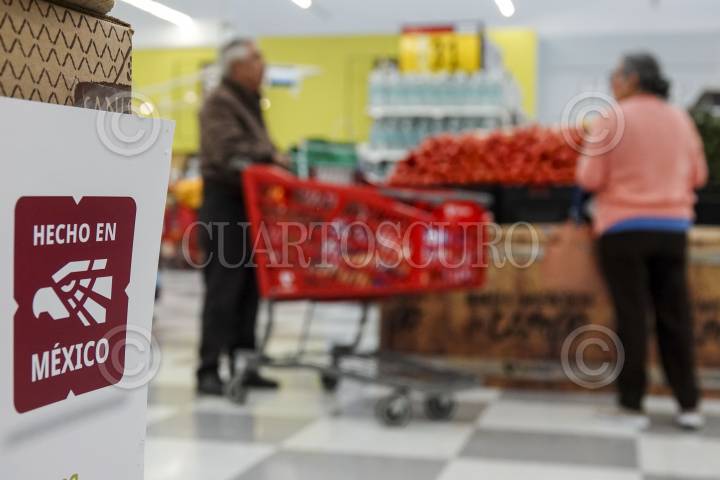 CIUDAD DE MÉXICO, 07MARZO2025.- Un letrero de “Hecho en México” se observa en una cadena de supermercados, al fondo una pareja realiza sus compras. Lo anterior, es parte de las acciones impulsadas por el llamado Plan México que tiene el fin de motivar la compra y consumo de marcas y productos mexicanos que se distribuyen en las tiendas de conveniencia y supermercados del país. FOTO: GALO CAÑAS/CUARTOSCURO.COM