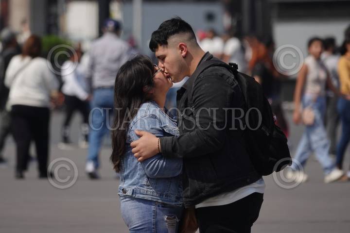 CIUDAD DE MÉXICO, 03FEBRERO2025.- Una pareja de enamorados se besa en la plancha del Zócalo. FOTO:GRACIELA LÓPEZ /CUARTOSCURO.COM