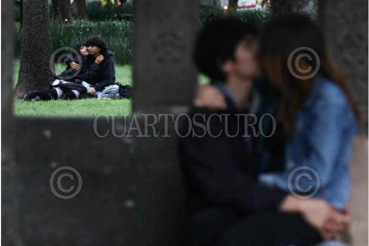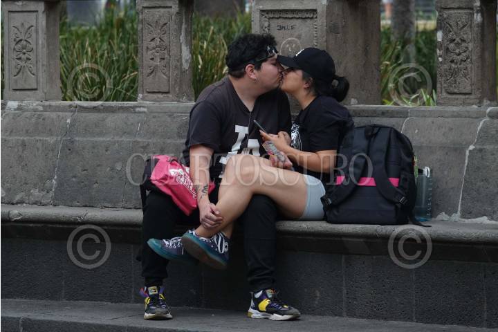Una pareja de jóvenes se besa apasionadamente en la Alameda Central