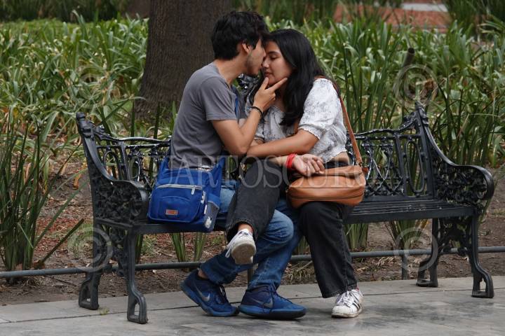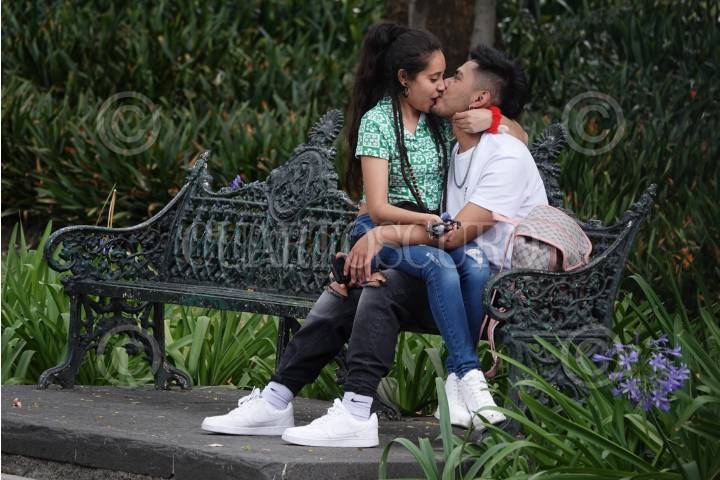 CIUDAD DE MÉXICO, 23MAYO2024.- Una pareja de enamorados se demuestran su amor en una de las bancas de la Alameda Central. FOTO: GRACIELA LÓPEZ /CUARTOSCURO.COM
