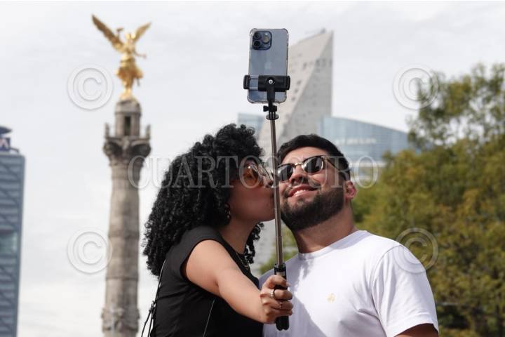 CIUDAD DE MÉXICO, 07ENERO2024.- Una pareja de enamorados se toma una selfie frente al Ángel de la Independencia. FOTO: GRACIELA LÓPEZ /CUARTOSCURO.COM