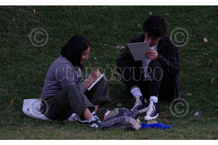 CIUDAD DE MÉXICO, 25ENERO2024.- Pareja de jóvenes estudian durante esta tarde en los pastos del Centro Nacional de las Artes. FOTO: GRACIELA LÓPEZ /CUARTOSCURO.COM