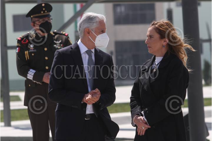 Alfredo del Mazo y Beatriz Gutiérrez Müller al término de la ceremonia conmemorativa por el 108 aniversario del Ejército.