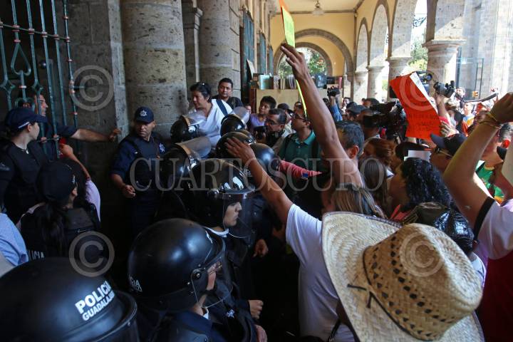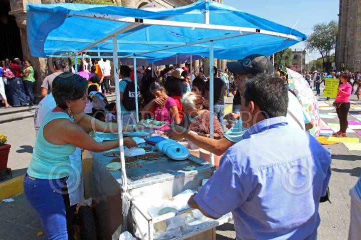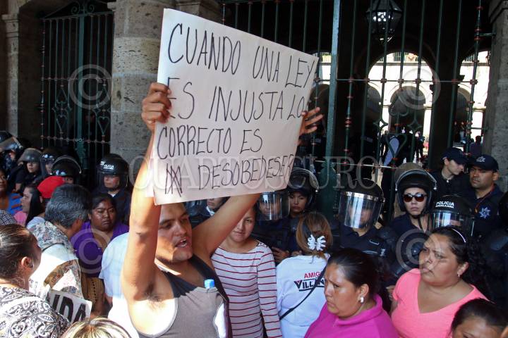 GUADALAJARA, JALISCO. 09NOVIEMBRE2015.-Comerciantes Ambulantes de Guadalajara se manifestaron a las afueras de la presidencia municipal, esto por que se oponen a retirarse de la calles del centro histórico de la ciudad, el día de mañana a partir de las 8 am, habrá antimotines y personal de todas las áreas del ayuntamiento para vigilar que los vendedores se instalen, también algunos comerciantes del baratillo mostraron su inconformidad y se encadenaron a las afueras del inmueble. FOTO: FERNANDO CARRANZA GARCIA / CUARTOSCURO.COM