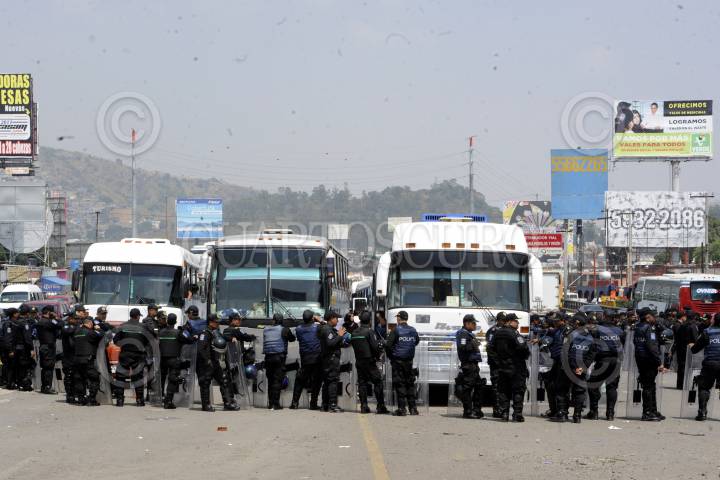 MÉXICO, D.F., 06OCTUBRE2011.- Elementos de Granaderos de la SSP del D.F. Encapsularon los camiones en los que viajaban manifestantes de la colonia Tulpetlac de Ecatepec cuando se dirigían a las instalaciones de CONAGUA al sur de la ciudad, para exigir la regularización de un predio en el que pretenden construir viviendas. FOTO: LUIS CARBAYO/CUARTOSCURO.COM