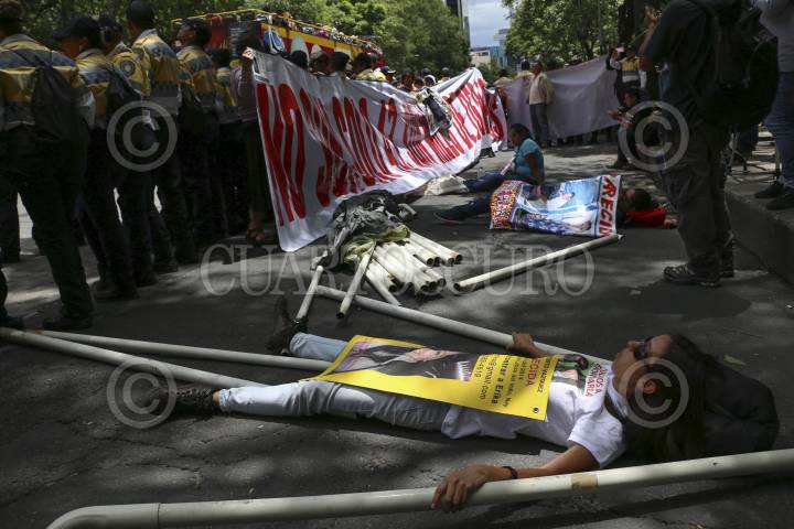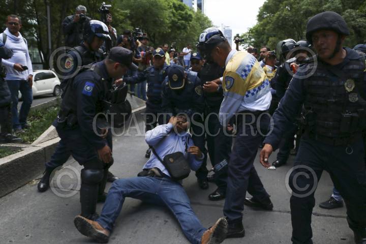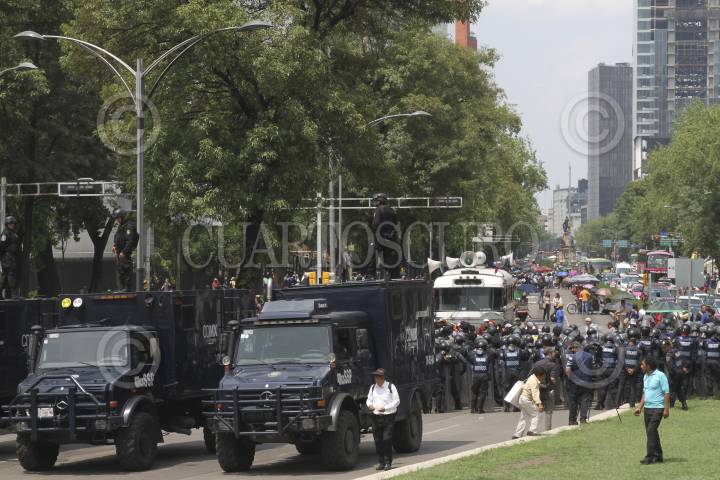 CIUDAD DE MÉXICO, 08JUNIO2016.- Maestro de la Coordinadora Nacional de Trabajadores de la Educación (CNTE) de la capital, realizaron un mitin en el Hemiciclo a Benito Juárez. Posteriormente recibieron a la caravana proveniente de Guerrero, Michoacán y Chiapas, para marchar por Paseo de Reforma. Durante el desplazamiento cientos de granaderos fueron cercándolos hasta obstruirles el paso en Insurgentes, frente al Senado de la República. FOTO: CUARTOSCURO.COM