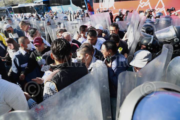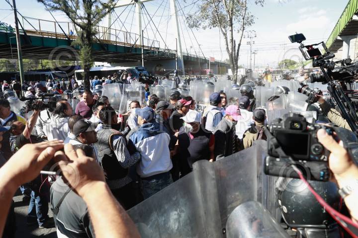 Transportistas que se manifestaban sobre la avenida Ignacio Zaragoza son encapsulados por elementos de la Secretaría de Seguridad Ciudadana para liberar carriles centrales.