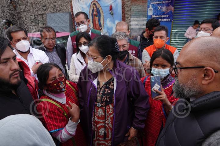 Nashielli Ramírez, secretaria de la Comisión Nacional de Derechos Humanos en la Ciudad de México, mantuvó un diálogo con integrantes de los desplazados de la comunidad triqui de Tierra Blanca, Oaxaca, en el encapsulamiento en donde se encuentran desde hace más de 36 horas en la calle de Mapimí, colonia Valle Gómez, alcaldía Gustavo A Madero