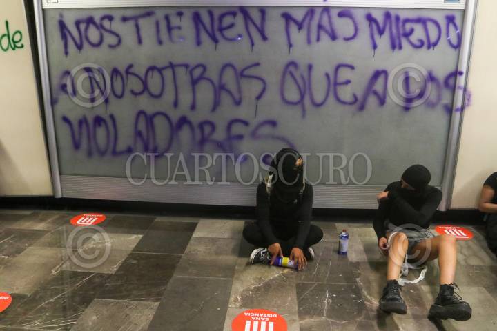 Mujeres integrantes del Bloque Negro toman un descanso en el metro, en donde realizaron diversas pintas. Ellas realizaron una manifestación en las inmediaciones del IPN para denunciar varios casos de acoso sexual que han quedado impunes en esa casa de es