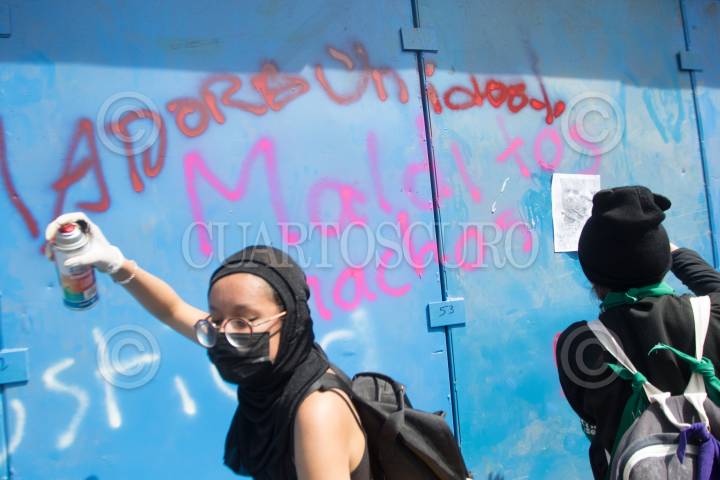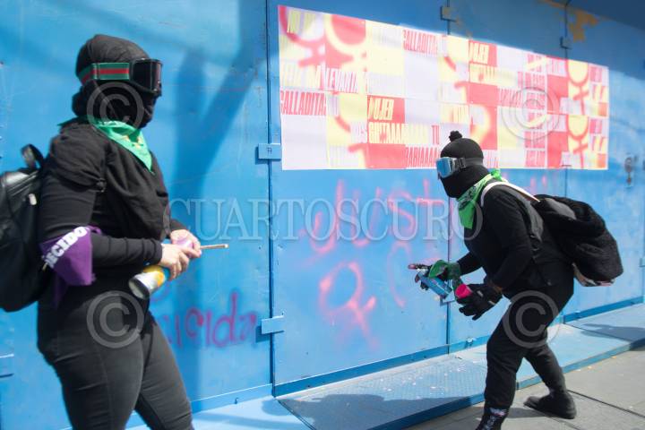 Mujeres de distintas colectivas intervinieron las vallas colocadas por el gobierno de la Ciudad en Palacio Nacional previo al 8m -Día internacional de la Mujer-. Organizadas pintaron durante la noche los nombres de mujeres sobrevivientes y víctimas de feminicidio como protesta contra las vallas que protegen el recinto.